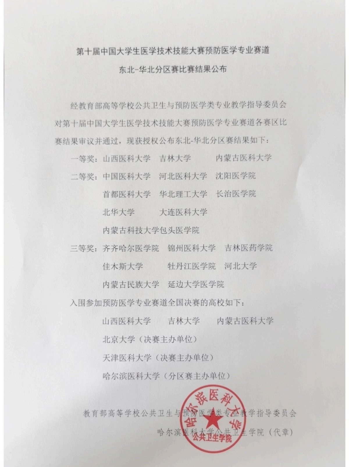 东北-华北分区赛共有23所院校参赛,其中北京大学和天津医科大学为决赛主办方、哈尔滨医科大学为分区赛主办单位不参与排名。在通过网络在线认证后进行了90分钟的网上在线答题,参赛同学沉着冷静应战,考场秩序井然,顺利完成比赛,喜获东北-华北分区赛一等奖,并成功入围决赛。