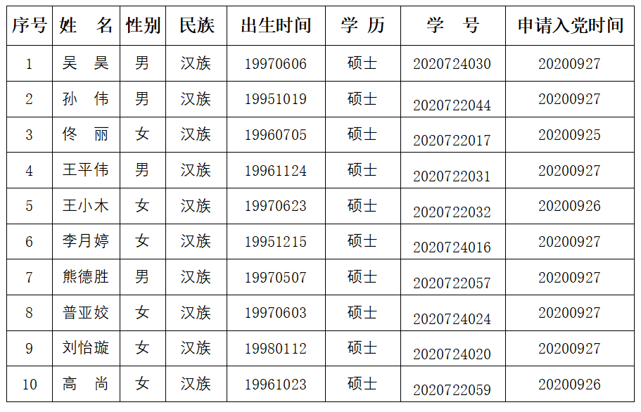 为了加强对发展党员工作的民主监督,确保发展新党员的质量,现将吴昊、孙伟、佟丽、王平伟、王小木、李月婷、熊德胜、普亚姣、刘怡璇、高尚10名发展对象的有关情况进行公示。